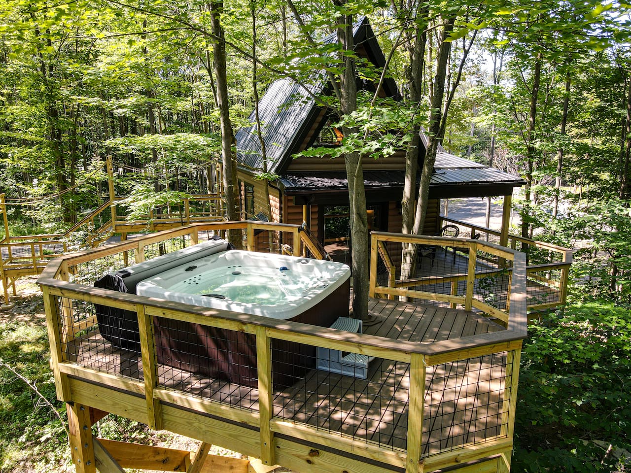 In this cozy treehouse, you will find that no detail has been overlooked. Enjoy the forest view where it’s possible you'll see wild deer or turkey. You will have all that you need to create your perfect country getaway. Build a fire in the fire pit, have a stargazing soak in the elevated hot tub, cozy-up by the indoor gas fireplace or relax in the indoor hammock. Once you arrive, you won't ever want to leave.