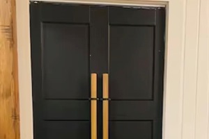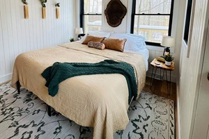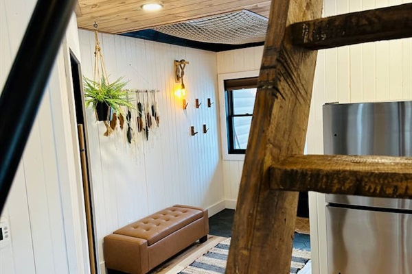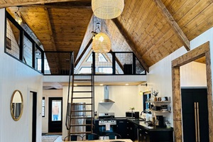 This dreamy second-story loft is accessible only by a ship’s ladder, adding an adventurous yet intimate feel. It features a king bed beneath a dramatic A-frame ceiling. Large triangular windows offer stunning views, making it the perfect hideaway.