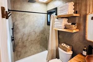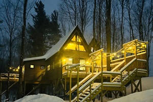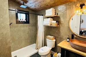 The treehouse deck offers a luxurious outdoor experience with a private, elevated hot tub. The hot tub is available 365 days 24/7. Additionally, you can enjoy a refreshing outdoor shower, May 15-October 15.